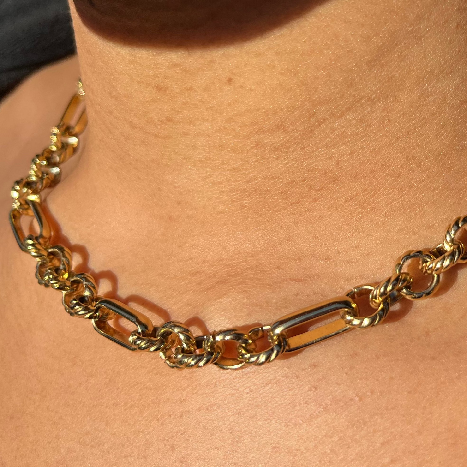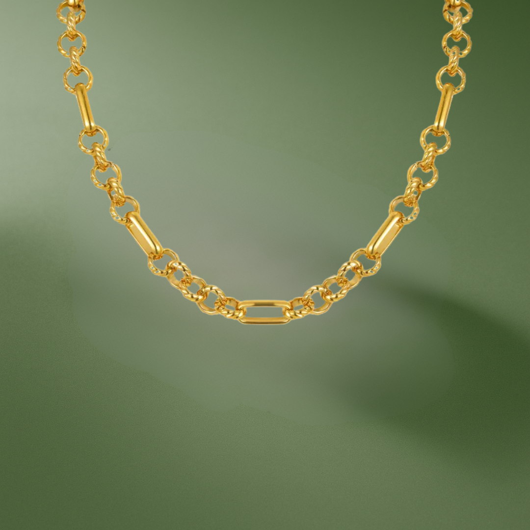 Composé de maillons entrelacés et rectangulaires, il évoque la souplesse d’une liane dorée qui capte la lumière à chaque geste.